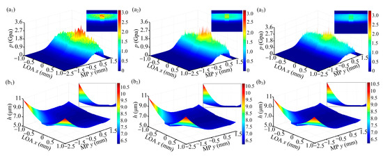 Figure 10 presents the contact performance and meshing characteristic distribution of the different characteristic scale parameter G. It can be observed from Figure 10(a1–a3,b1–b3) that, the greater tooth surface asperity peak is, the greater the pressure and film thickness fluctuation are, and the thinner the local film thickness in the contact zone is, but the lower the average pressure is. This is mainly because the increasing asperity peak reduces the contact area of the rough tooth surface, and the loading capacity of the tooth surface is weakened. Comparing Figure 10(c1–c3,d1–d3), it can be found that G has a remarkable influence on the tooth surface friction and temperature rise. With the increase in G, the asperity peak deformation increases and the asperity friction force becomes the dominant part; a slight increase in and violent fluctuation of the friction coefficient are observed. In Figure 10(d1–d3), the scale parameter G effect increases the maximum value and fluctuation of the temperature rise, but the decrease in the asperity peak amplifies the G effect on the average temperature rise and secondary temperature rise peak, which indicate the asperity peak has a significant thermal effect during lubrication. It can be found from Figure 10(e1–e3) that the contact stiffness is very close under the different G, but the fluctuation is intensified markedly, indicating the G has little effect on the contact stiffness. The influence of G on the kcm is significant. Specifically, the larger the G is, the smaller the comprehensive meshing stiffness is, but the stronger the fluctuation will be.
