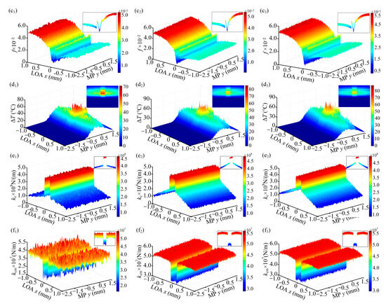 In the same position, due to the randomness of the asperity peak and the larger asperity peak deformation with a larger load, the fluctuation of the pressure in Figure 7(a1–a3) is becoming more and more obvious, and the second pressure-peak at the outlet of the contact zone increases significantly with the increasing T1. In Figure 7(b1–b3), the oil film thickness shows the opposite trend compared to the oil film pressure, but the necking phenomenon of the oil film at the outlet becomes more and more obvious. The friction coefficient is closely related to the input torque, lubricant, and tooth surface morphology, which directly affects the thermal deformation and temperature rise. In the double-tooth meshing zone, the friction coefficient gradually decreases as the contact point moves toward the pitch point, and a sudden increase appears from double-to-single teeth meshing. In the single-tooth meshing zone, the friction coefficient presents a “V”-shaped structure with a low left and high right, and reaches a minimum value instead of being 0, which is caused by the local asperity contact. When the gear teeth enter the double-tooth meshing zone again, the friction coefficient suddenly decreases, and then gradually increases with the movement of the contact point. As T1 increases from 20 N·m to 300 N·m, the h becomes thinner gradually, and the asperity peak contact probability and contact area increase, which lead to the friction coefficient increase. Meanwhile, the thermal elastohydrodynamic lubrication of the gear tooth contact state evolves to the mixed thermal elastohydrodynamic lubrication, and the meshing impact is weakened. It can be seen from Figure 7(d1–d3) that the ΔT is significantly affected by the asperity peak distribution, the temperature rise in the single-tooth meshing zone is obviously greater than that in the double-tooth meshing zone, and the maximum ΔT and the secondary peak temperature rise increase with the increasing torque. It can be found from Figure 7(e1–e3,f1–f3) that the kc and kcm increase significantly and the fluctuation reduces under different T1, which is due to the larger contact load increasing the contact of the tooth surface asperity peak.