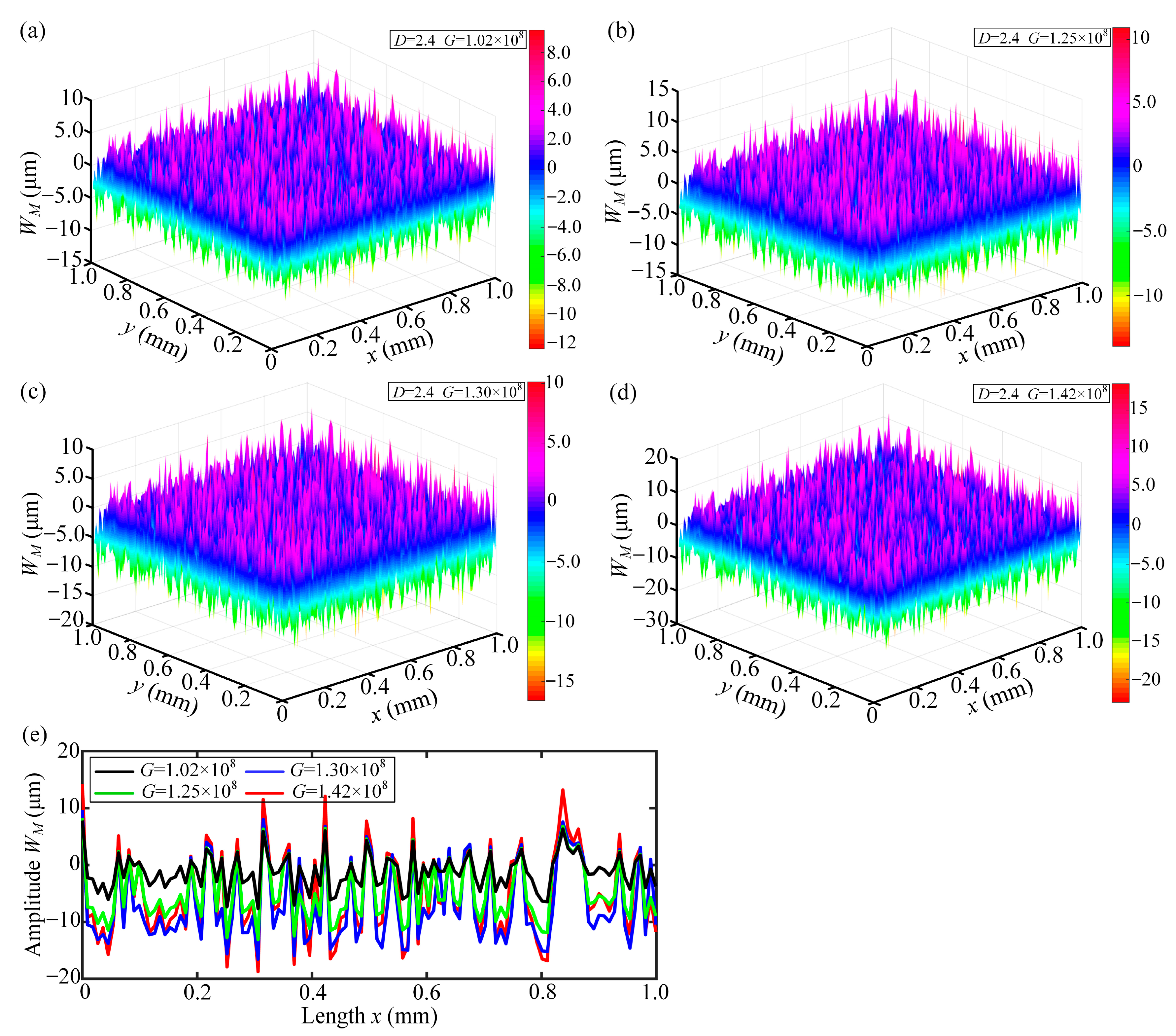 - The fractal parameters have significant effects on the meshing characteristics. With a decreasing D and increasing G, the pressure and film thickness, friction, and temperature rise exhibit a nonlinear variation, but the contact stiffness and comprehensive meshing stiffness have clearly diminished, which lead to a poor lubrication state of the gear. The research work can provide certain guidance for the design and processing of gears.