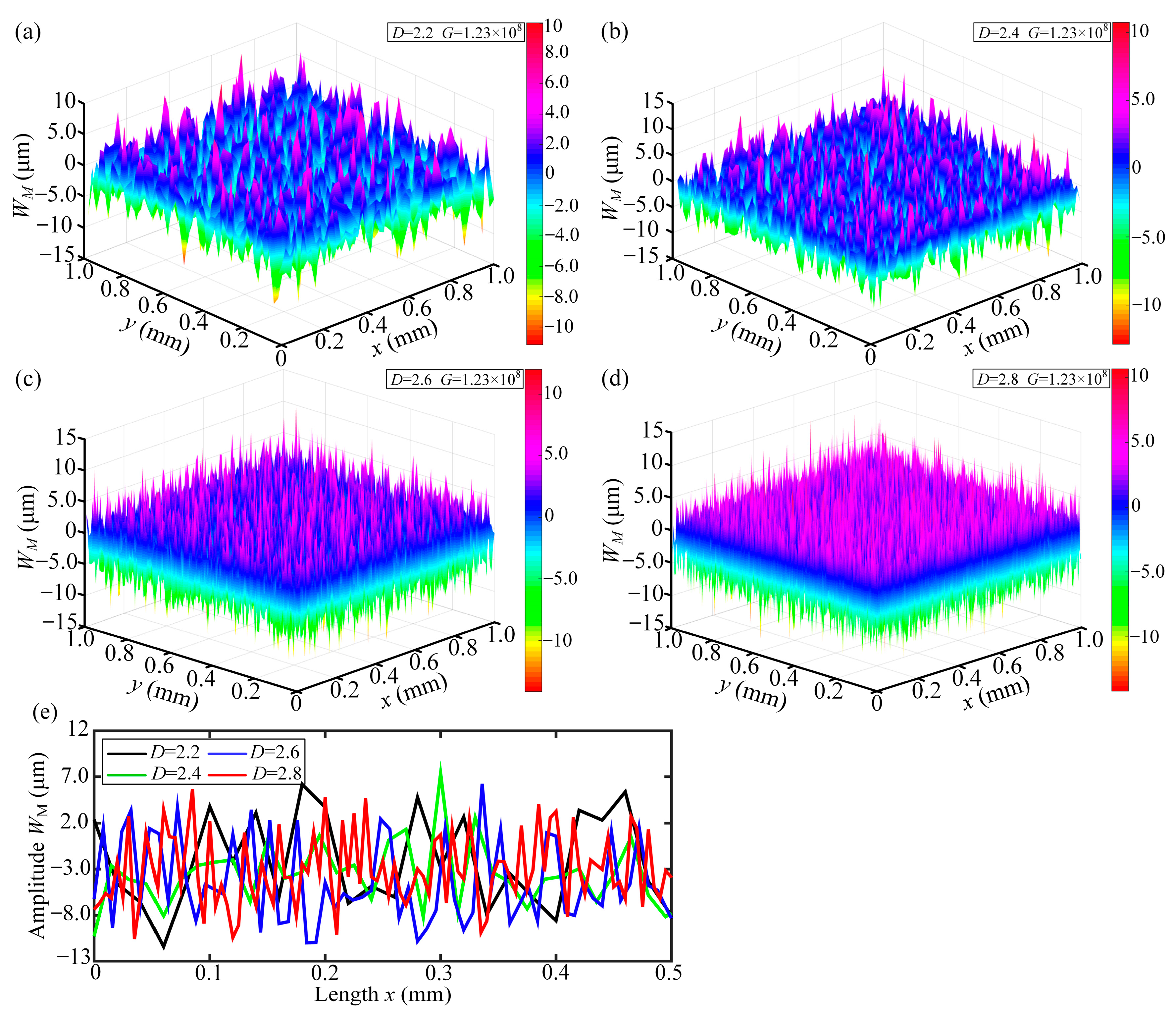 - The fractal characteristic of the tooth surface morphology is verified by experiment, which is described using the WM fractal function. Compared to the lubrication performance of the smooth and rough tooth surfaces, the maximum values of the pressure and temperature rise are obviously greater by 29.82% and 24.7% compared to that of the smooth tooth surface, which aligns more closely with actual conditions.
