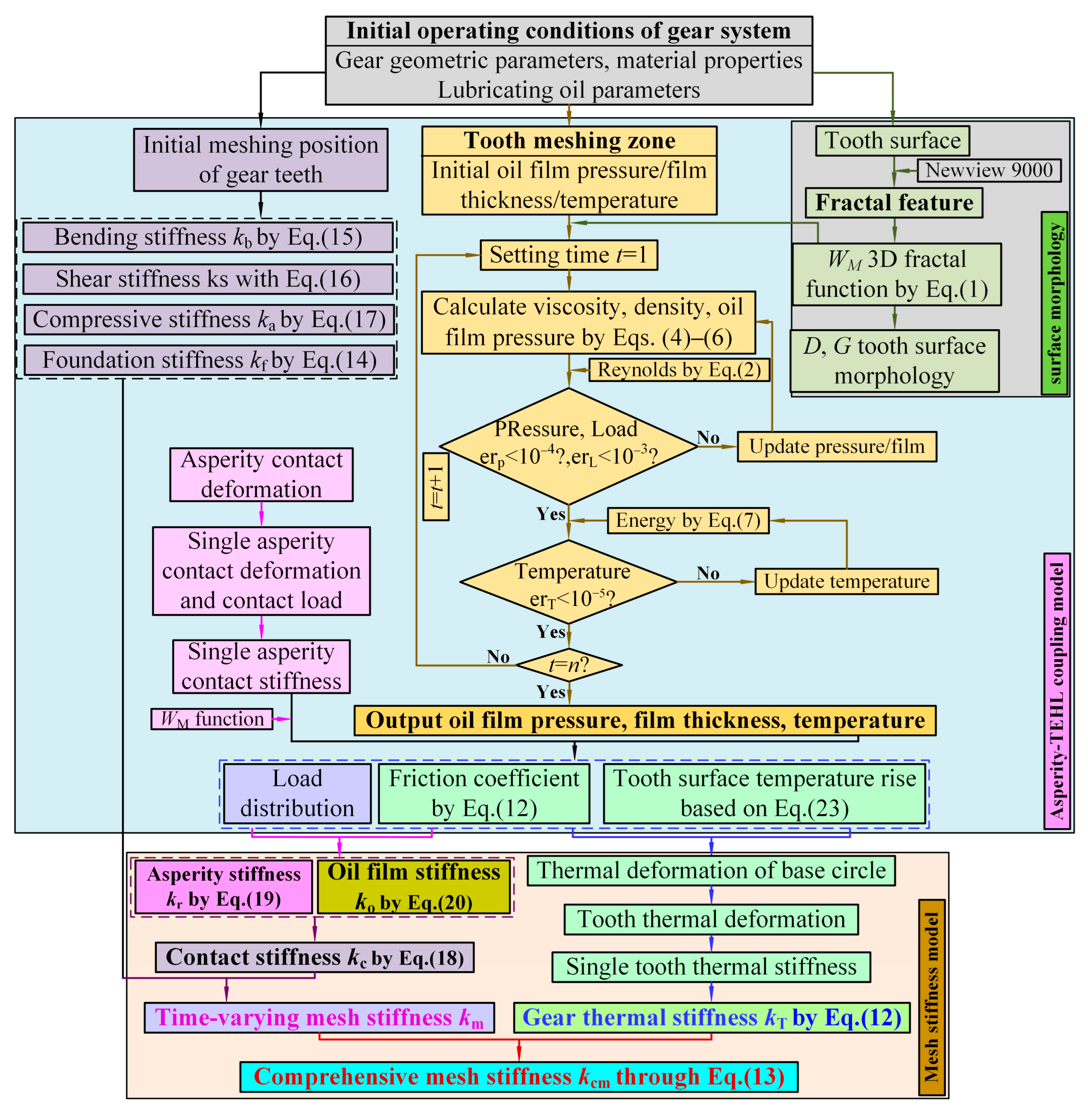 - Zhou, C.J.; Xing, M.C.; Hu, B. A mesh stiffness model with the asperity contact for spur gear in mixed elastohydrodynamic lubrication. J. Braz. Soc. Mech. Sci. 2022, 44, 466. [Google Scholar] [CrossRef]