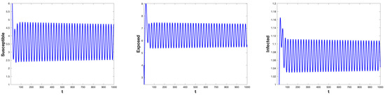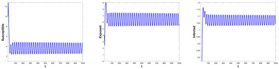When , the time series of the state variables , , and for System (5) with and (no control). As the delay exceeds the critical value , a Hopf bifurcation occurs, leading to the emergence of stable periodic oscillations.