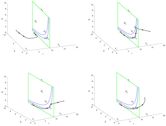 - When , satisfied , but , and satisfied , but ; according to the Definitions 1 and 2, both and are virtual equilibrium points.