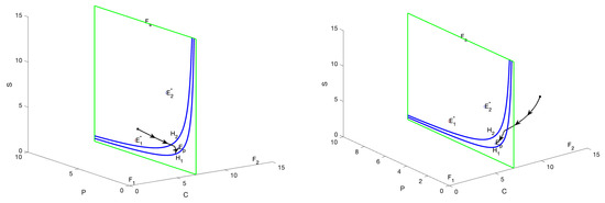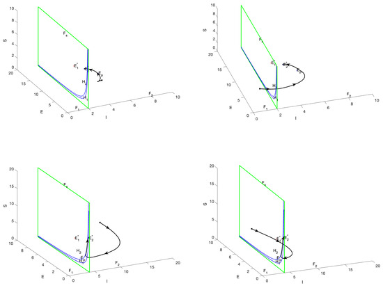 When and are virtual equilibria, then and . stabilizes at . Figure 5 shows the possible trajectories: A trajectory whose initial condition lies in the region will converge to as ; a trajectory that starts in the region will pass through the manifold and then into the region, finally converging to ; a trajectory whose initial condition lies in the region will hit and slide downward on and then converge to . When , and are virtual equilibria. According to the calculation, . As increases, System (5) will exhibit a bifurcation of periodic solutions with the bifurcation of regular equilibria around , as shown in Figure 6.