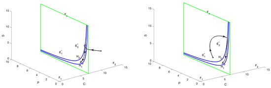 Through direct calculation, we get , and . For different threshold options , System (5) exhibits a variety of possible dynamic behaviors. According to Proposition (1), for system , we choose , then is a regular equilibrium and is a virtual equilibrium. And the critical value is . When , the regular equilibrium is stable, and System (5) will demonstrate a bifurcation of periodic solutions coinciding with the bifurcation of regular equilibria at . For system , we choose , then is a virtual equilibrium and is a regular equilibrium, and the critical value . When , the regular equilibrium is stable, and System (5) will demonstrate a bifurcation of periodic solutions coinciding with the bifurcation of regular equilibria at . As shown in Figure 1 and Figure 2.
