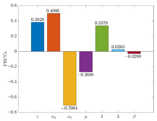 PRCC were calculated to assess the relationship between the basic reproduction number and the model parameters.