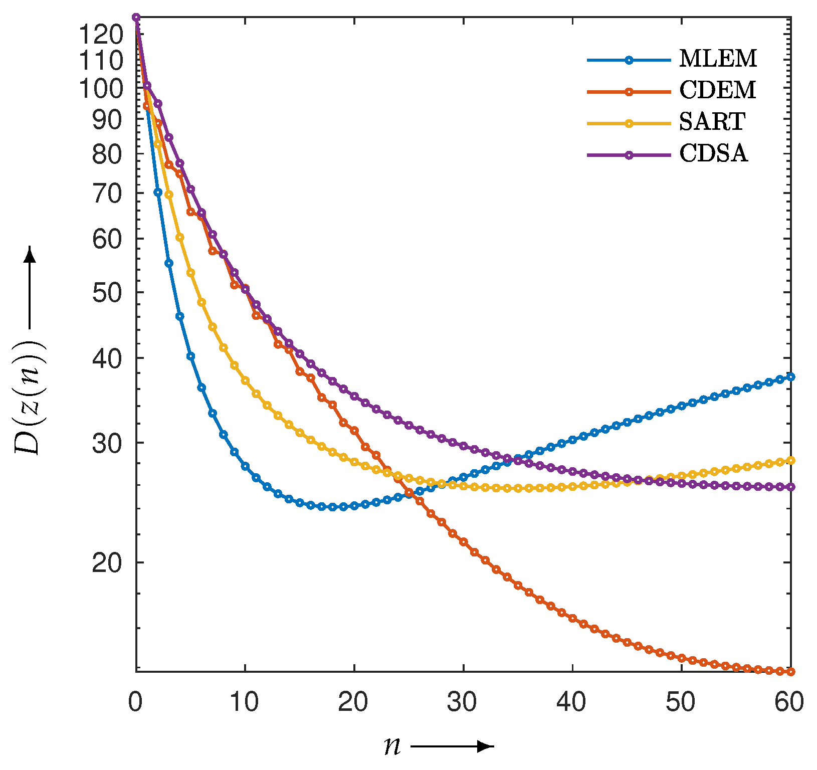 - Shepp, L.A.; Vardi, Y. Maximum likelihood reconstruction for emission tomography. IEEE Trans. Med. Imaging 1982, 1, 113–122. [Google Scholar] [CrossRef] [PubMed]