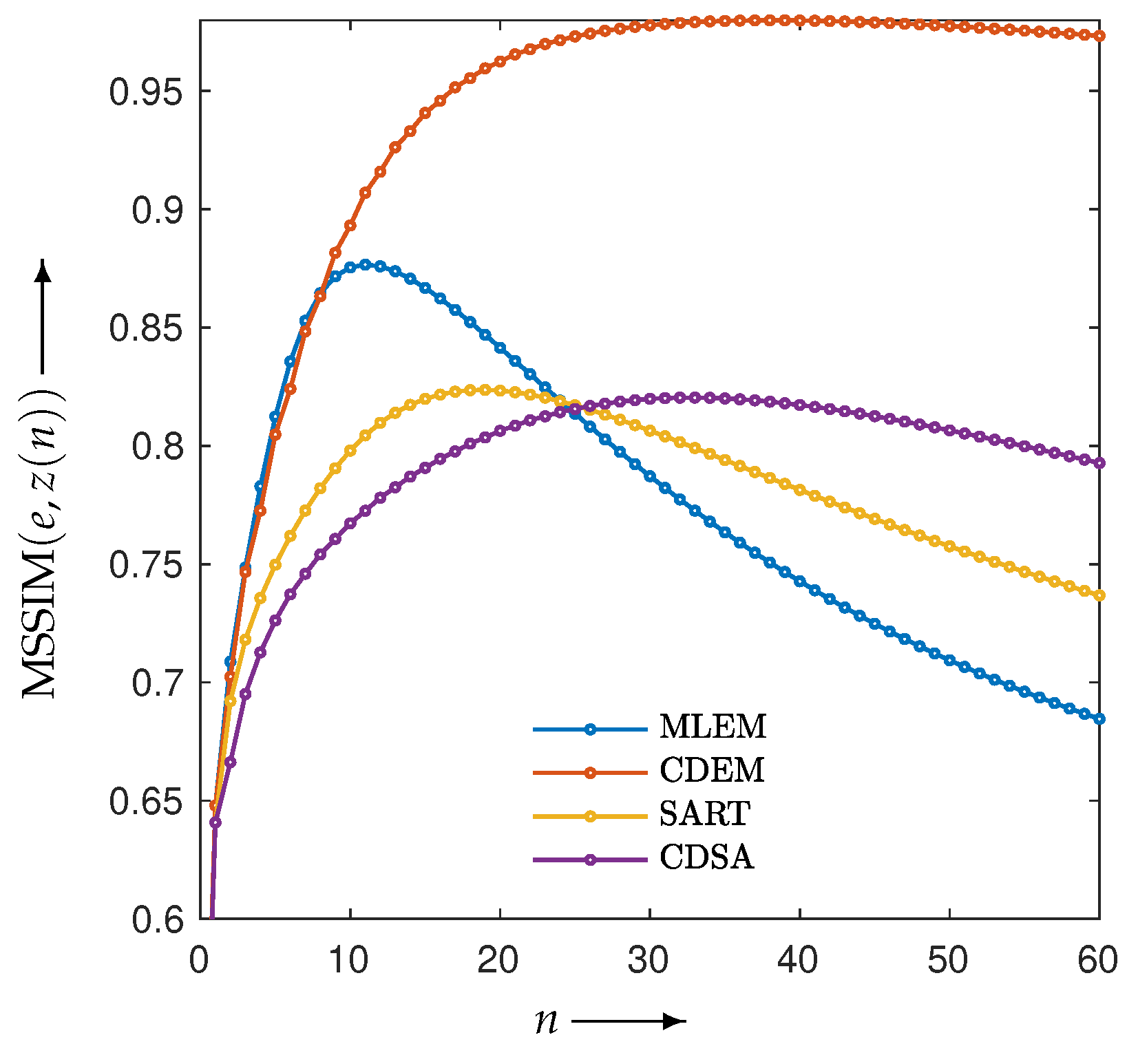 - Badea, C.; Gordon, R. Experiments with the nonlinear and chaotic behaviour of the multiplicative algebraic reconstruction technique (MART) algorithm for computed tomography. Phys. Med. Biol. 2004, 49, 1455–1474. [Google Scholar] [CrossRef] [PubMed]