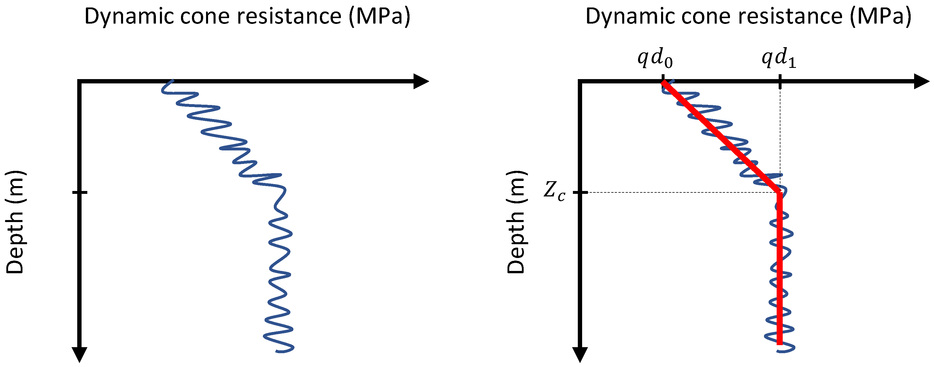 - Penetrometric responses: in situ indices and obtained with a lightweight dynamic cone penetrometer (LDCP). The parameter represents the dynamic cone resistance recorded at or near the surface, while corresponds to the stabilized resistance reached once the soil becomes confined at depth. This transition occurs at a critical depth , beyond which the resistance tends to remain constant. These values were determined consistently for all cases included in the database.