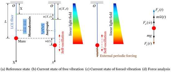 - Bai, C.; Kang, J.; Wang, Y. Light-induced motion of three-dimensional pendulum with liquid crystal elastomeric fiber. Int. J. Mech. Sci. 2024, 266, 108911. [Google Scholar] [CrossRef]