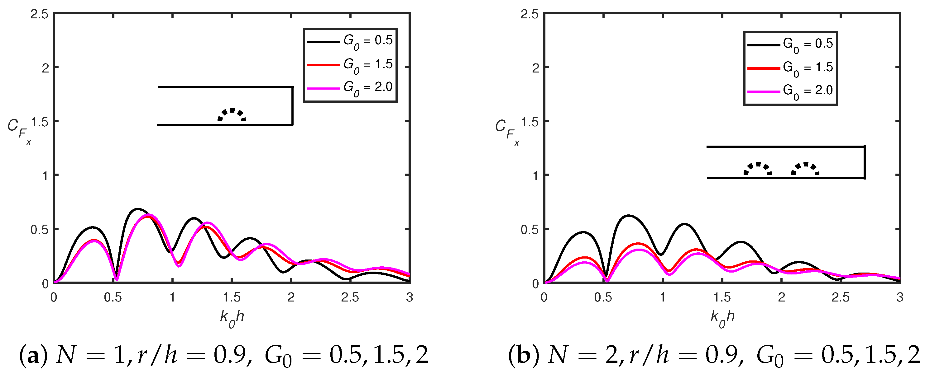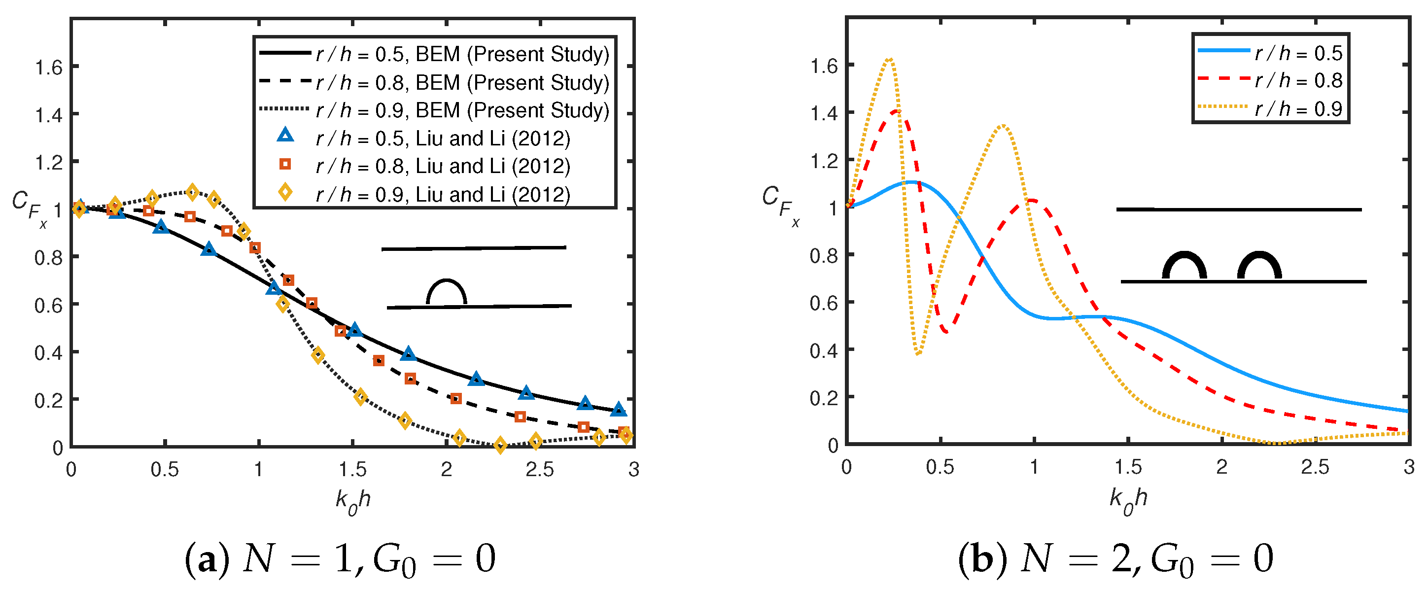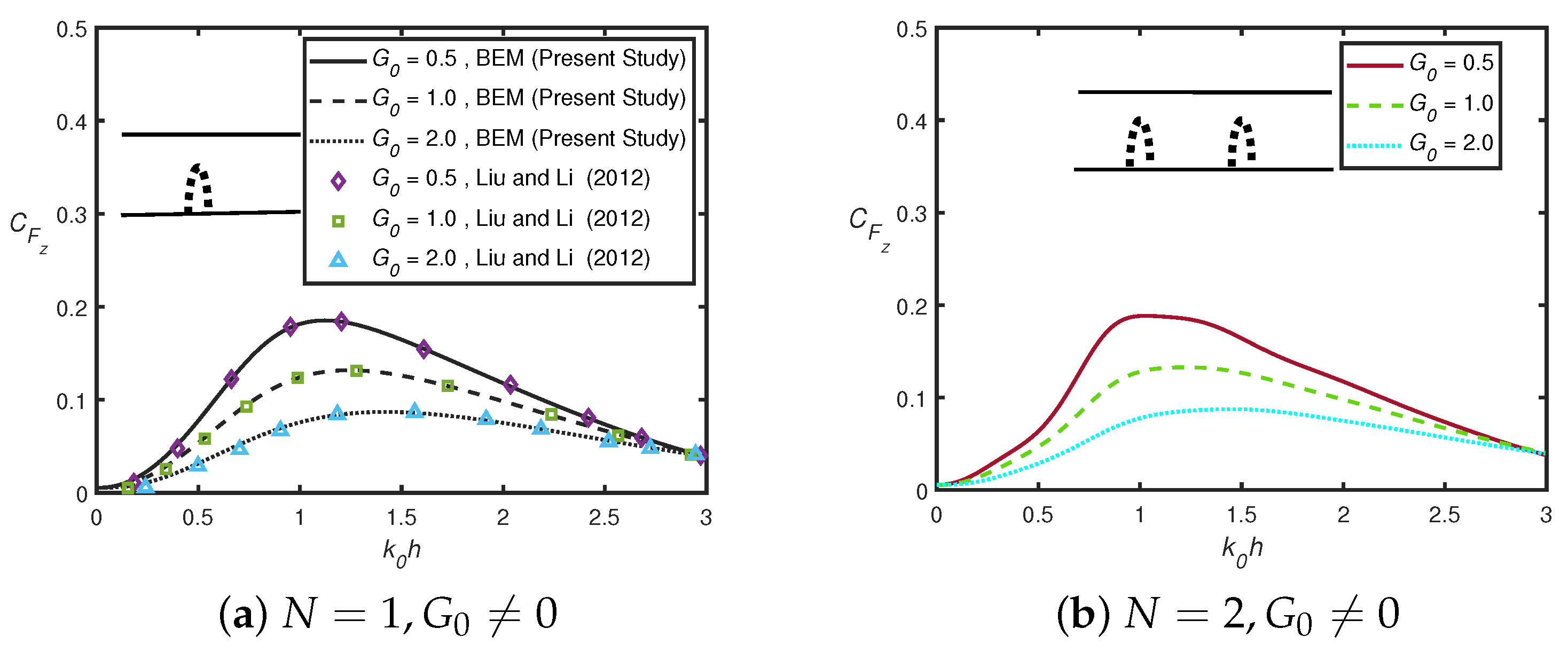 - In addition, when wavenumbers shift to zero, the vertical force converges to zero for multiple permeable semicircular humps, whilst it converges to unity in the case of multiple impermeable semicircular humps.