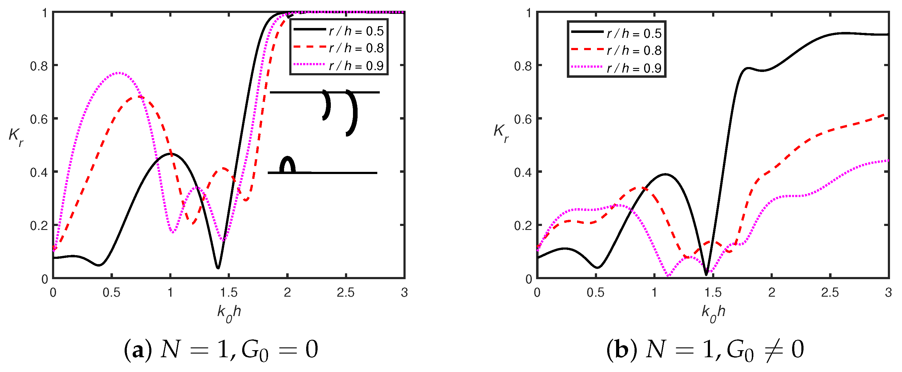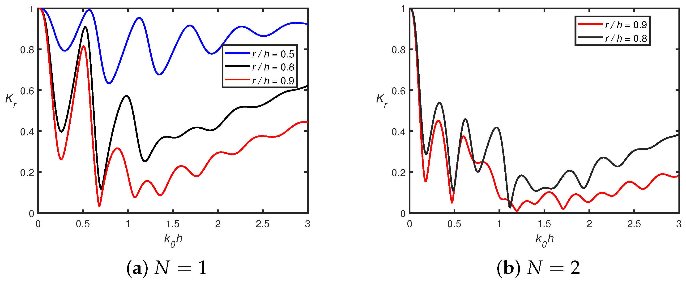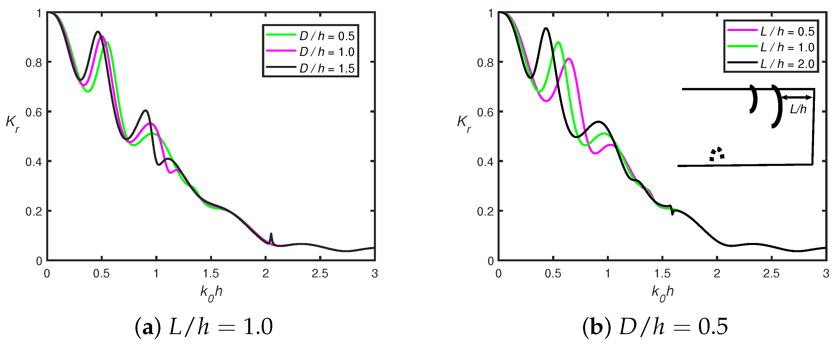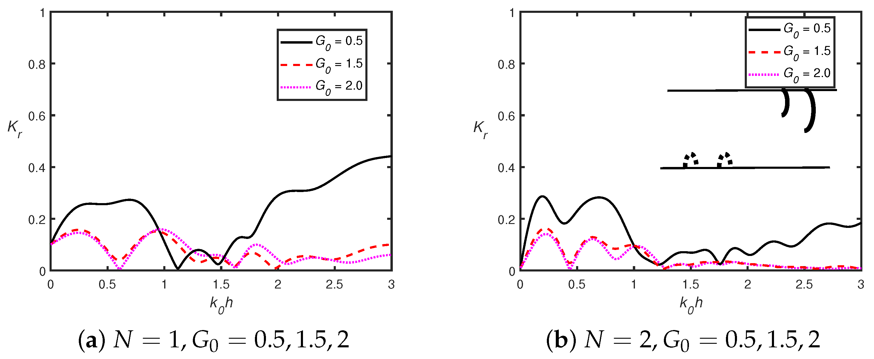- In the presence of a shore-fixed wall, the higher Bragg reflection occurs for smaller wavenumbers, which is due to constructive interference between the semicircles and the rigid wall. The peak amplitude in the reflection coefficient decreases as the number of semicircles increases.