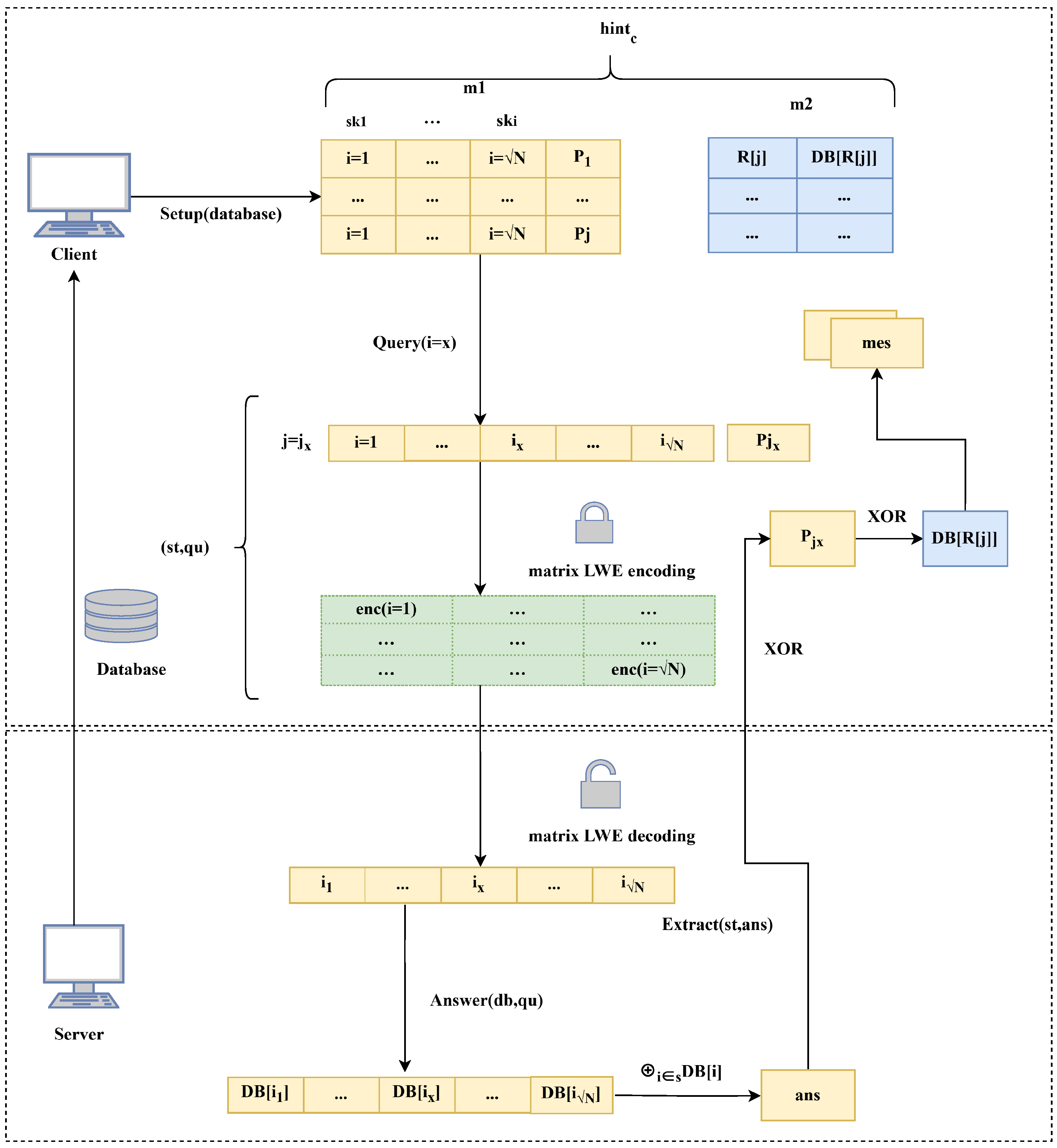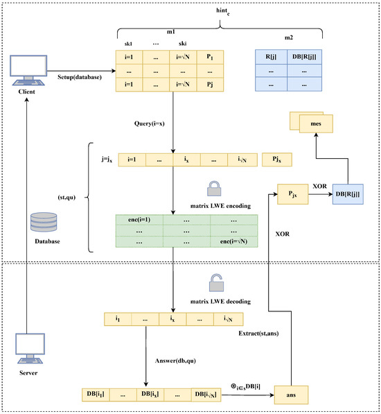 - Corrigan-Gibbs, H.; Henzinger, A.; Kogan, D. Single-Server Private Information Retrieval with Sublinear Amortized Time. In Proceedings of the Annual International Conference on the Theory and Applications of Cryptographic Techniques (EUROCRYPT 2022), Trondheim, Norway, 30 May–3 June 2022; Springer International Publishing: Cham, Switzerland, 2022; pp. 3–33. [Google Scholar] [CrossRef]