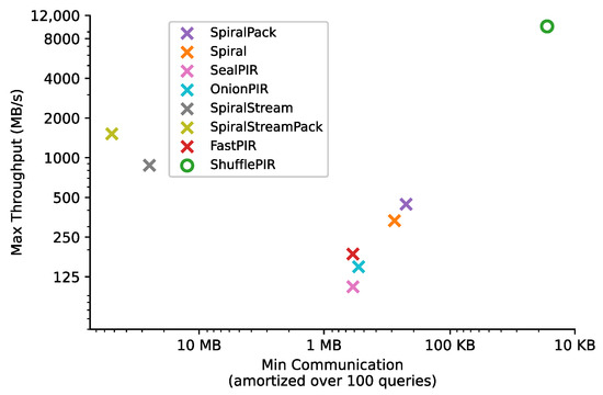 The trade-off maximum throughput and minimum communication cost for each PIR scheme using a 1 GB database. Each point represents the record size that either maximizes throughput or minimizes communication cost. The communication cost refers to the total communication volume per query and is amortized over 100 queries.