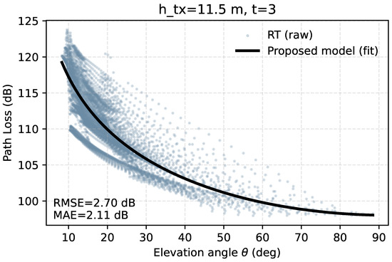 Figure 2 show a comparison of the curve of path loss related to elevation angle. The horizontal axis represents the elevation angle, and the vertical axis represents the path loss. The colored scatter points represent the original samples of ray tracing, and the black dashed line represents the fitting result of the elevation-angle perception model proposed in this paper, with error indicators provided to quantify the fitting accuracy. This figure corresponds to a set of results under a fixed transmission height and is used to demonstrate the monotonic change of the model with elevation angle and the saturation trend in the high-elevation-angle range. The “measured curve” in all subsequent figures in this article is obtained through the same data cleaning and fitting process to ensure comparability and reproducibility under different environments.