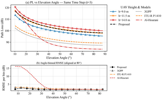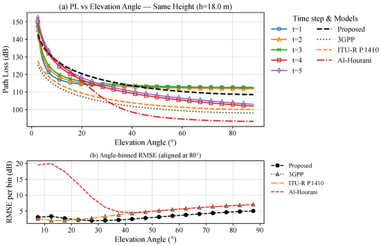 (a) Path loss vs. elevation angle at a fixed UAV height (h = 18.0 m) across five time steps (t = 1–5), with baseline model comparison (3GPP, ITU-R P.1410, Al-Hourani). (b) Angle-binned RMSE vs. elevation angle after 80° alignment (Proposed vs. 3GPP, ITU-R P.1410, Al-Hourani). MHz, , , , , .
