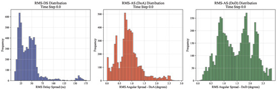 The RMS Delay Spread (RMS-DS) represents the spread of signal arrival times due to multipath propagation in a wireless channel. It indicates how dispersed the received signal energy is over time. In the Figure 9, the RMS-DS values are primarily distributed within the range of 75–150 ns, exhibiting a statistical characteristic close to a normal distribution. The peak is observed in the range of approximately 100–125 ns, indicating that this delay spread value occurs most frequently in this channel environment. The relatively small RMS-DS values (<175 ns) indicate that the channel’s multipath effect is relatively weak. This distribution characteristic suggests favorable channel conditions, likely corresponding to line-of-sight propagation or an environment with fewer reflecting objects. The concentrated distribution of delay spreads benefits system timing synchronization and equalizer design.