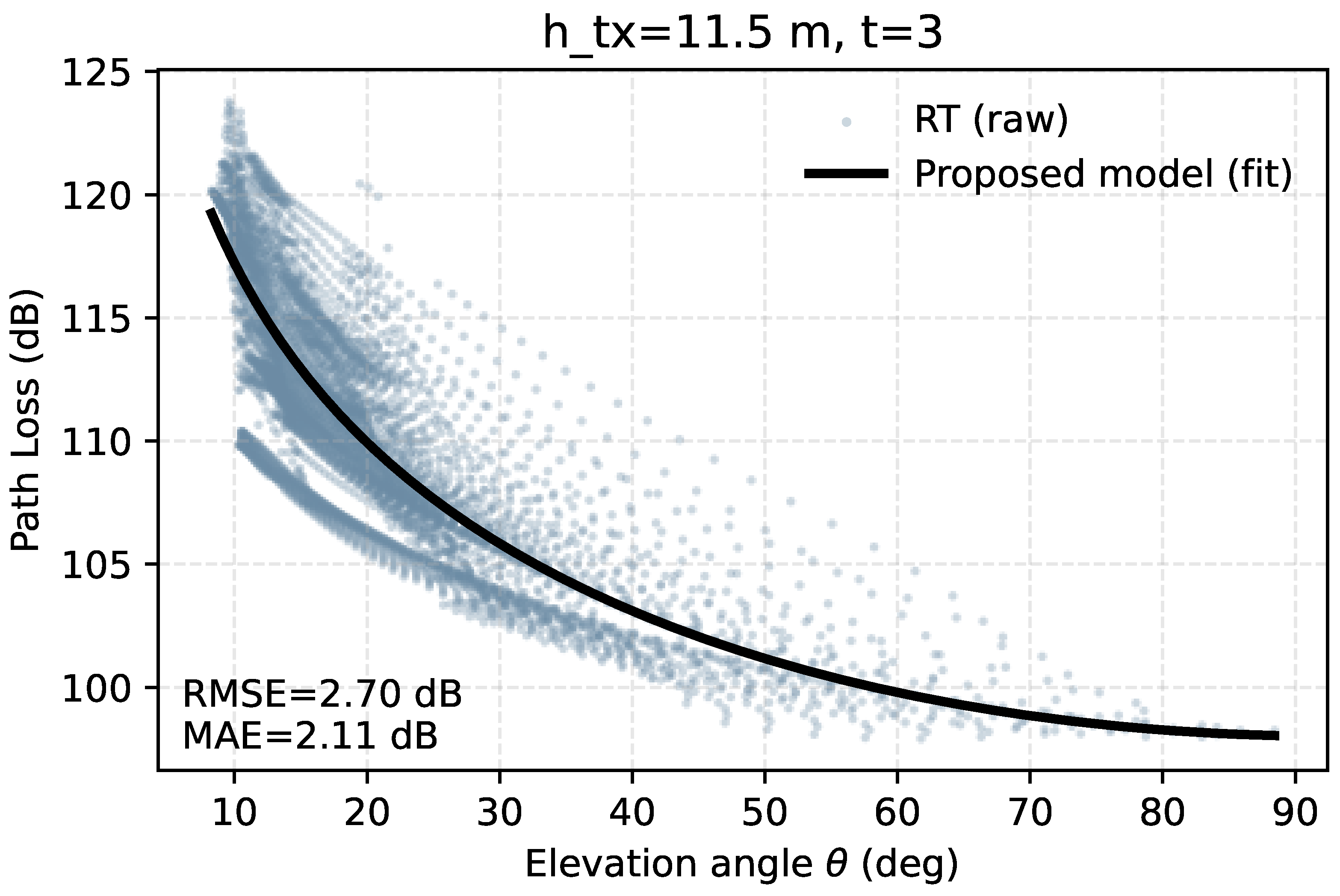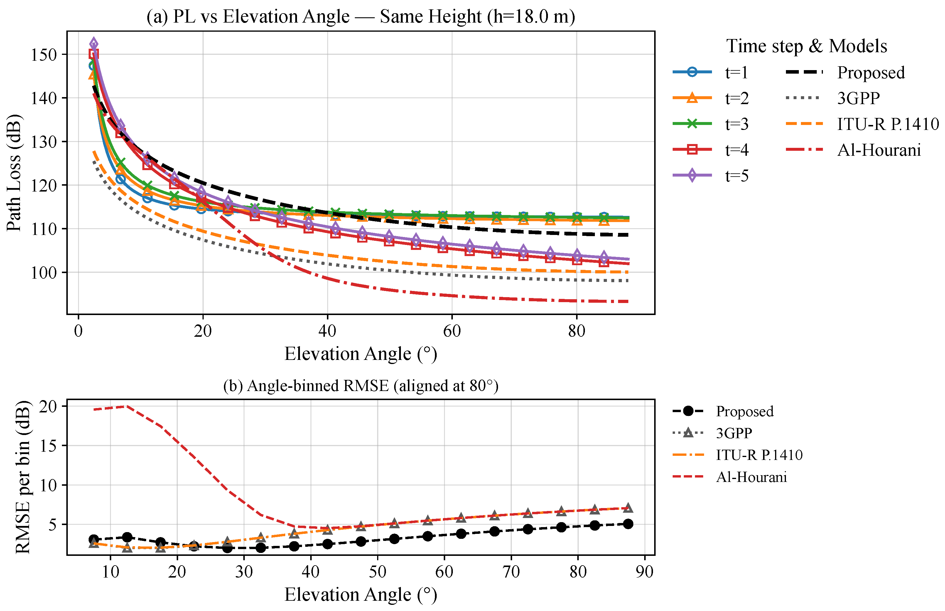- Dynamic Adjustment of Link Budget: Traditional models use a fixed margin, whereas our model achieves dynamic path-loss prediction dependent on the elevation angle () through . The communication system can dynamically calculate the current expected path loss based on the real-time elevation angle () and stored local parameters (), thereby enabling real-time adjustment of transmit power or modulation and coding schemes to improve power efficiency.