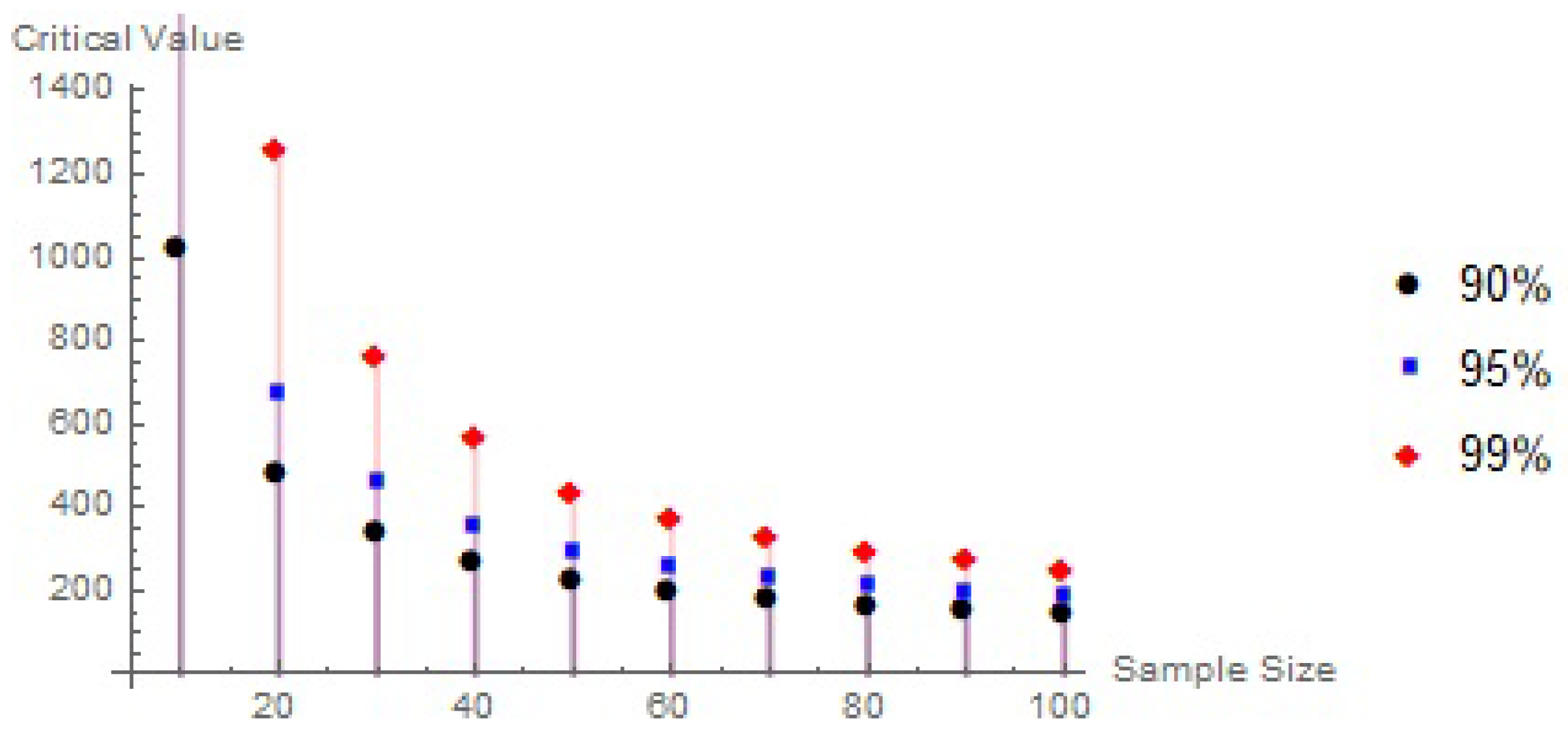 Monte Carlo simulation of critical values: Critical values of the test statistic are obtained through Monte Carlo simulations using 10,000 replications across varying sample sizes. This provides reference thresholds for significance testing at common confidence levels of and .