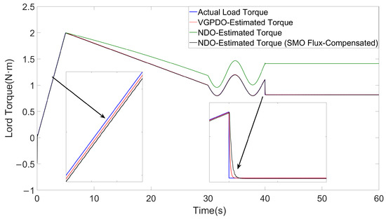 The flux linkage estimation results of the two observers are compared in Figure 2. During t = 0–40 s, the proposed VGPDO demonstrates superior dynamic tracking performance for flux estimation compared to the SMO proposed in [25], with no significant chattering phenomena observed. Following the abrupt flux linkage demagnetization event at t = 40 s, the SMO exhibits significant high-amplitude chattering in tracking. In contrast, VGPDO demonstrates smoother and more stable tracking performance. Ultimately, when both flux linkage and load torque stabilize after t = 40 s, VGPDO demonstrates a smooth transient response with rapid convergence, achieving asymptotic stability.