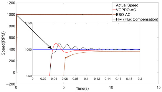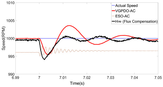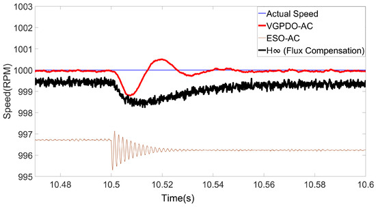 To demonstrate the robustness of the proposed VGPDO-AC control strategy, the dynamic speed responses of the PMSM under flux linkage and load torque step changes are illustrated in Figure 9 and Figure 10, respectively, with the corresponding performance metrics provided in Table 5 and Table 6.