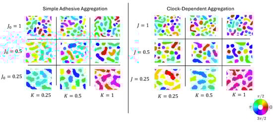 We conducted two types of simulations: simple adhesive aggregation, characterized by clock-independent adhesion (), and clock-dependent aggregation (). Figure 1 shows a comparison of the typical results for different values of the adhesion strength J or and the clock coupling rate K. For any combination of parameters, aggregation of clusters was observable, where the number of clusters and their shape depended on the parameters. The clock phases were synchronized within clusters. For the maximum clock coupling rate and minimum adhesion strength, all the cluster clock phases were almost the same for all clusters (“global synchronization”); for all the other values, different clusters were synchronized to different clock values (“local synchronization”).