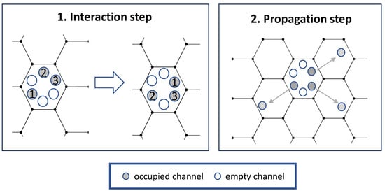 The key idea of the model is that spatiotemporal evolution is modeled via two steps: an interaction step and a propagation step; see Figure 2 for more information. In the propagation step, cells move from one node to a neighboring one in the direction given by their channel. In the interaction step, the state of each node is updated. For this, each possible rearrangement of the particles in a node (state with clock values ) is assigned an energy . A new state is then chosen with probability