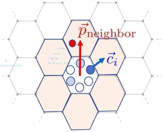 Here is the vector of direction corresponding to channel i, and is a vector in the direction of a (first-order) neighbor’s lattice site. (See Figure 3). The clock values of the particle in channel i and the neighbor are and , respectively.