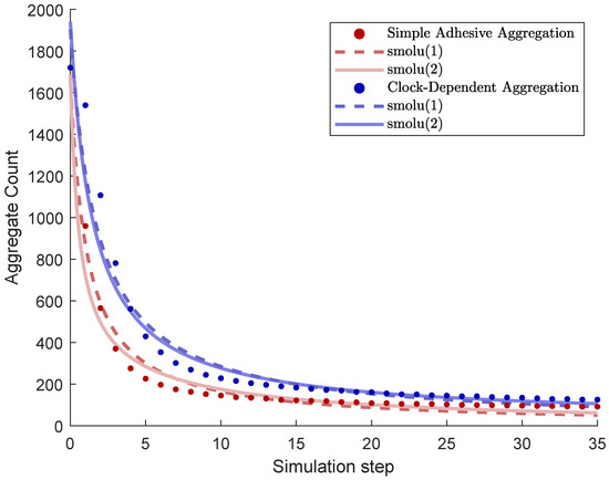We performed weighted least squares curve fitting for the data, which consists of the aggregate count at each time step, averaged over 40 simulations. The fitted parameters were and for smolu(1) and and for smolu(2). The weights were the inverse variances of the data each time step to account for size effects, also known as (nonlinear) inverse variance weighted least squares regression, a common approach when fitting data that consists of time series of averages with distinct standard deviations at each point in time, see, e.g., [30]. The results were as followed (also see Figure 4):