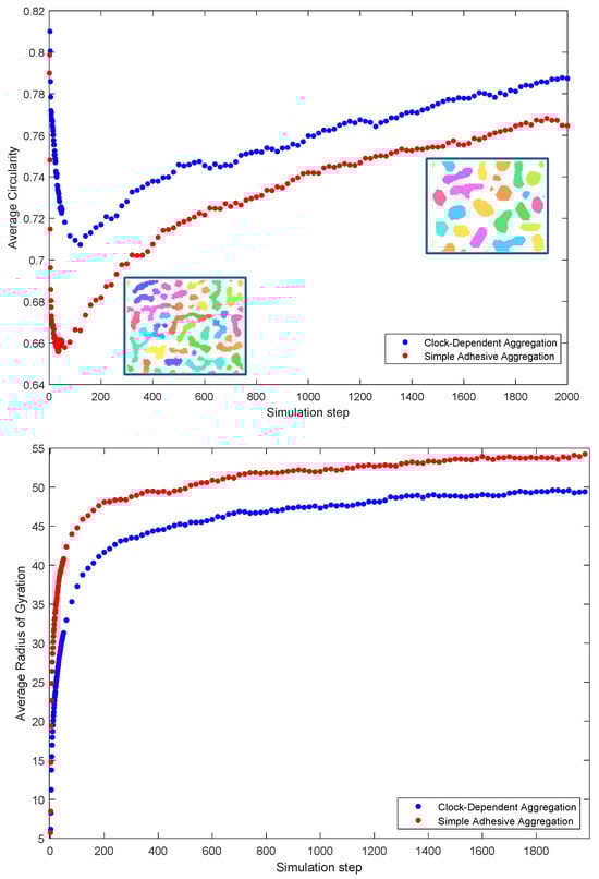 Measures of compaction: average circularity (top) and average radius of gyration (bottom) as a function of time (simulation step). Both are based on simulations. Inlaid are images of typical aggregation stages showing the gradual “rounding up” of clusters. (Colors in the inlaid images correspond to phases as in Figure 1).