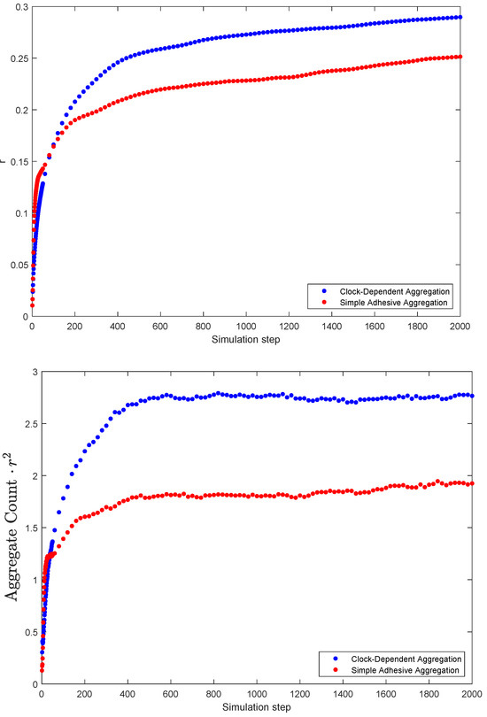 Figure 4 shows the number of aggregates as a function of time steps. We compared the two cases of simple adhesive aggregation and clock-dependent aggregation. Aggregation is slower in the case of clock-dependent aggregation, resulting in significantly larger number of aggregates.