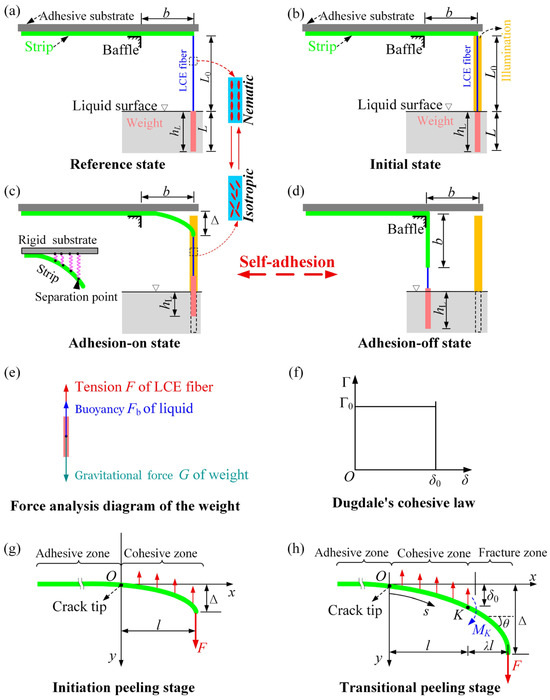 To compute the critical detachment force, schematics of the initial and transitional peeling stages are presented in Figure 2g,h, respectively. The light-induced contraction and recovery rates of LCE materials are closely related to their thickness. Specifically, the photothermal relaxation process involves a gradual decrease in temperature, resulting in a slow recovery of LCE deformation. Consequently, the strip undergoes a progressive detachment from the initial adhesion-on state to the critical adhesion-on state. Once the detachment force reaches the critical detachment force in the adhesion-on state, rapid detachment of the strip may occur. Similarly, the strip undergoes a progressive reattachment from the initial adhesion-off state to the critical adhesion-off state. Once the detachment force reaches the critical attachment force in the adhesion-off state, rapid reattachment of the strip may occur. Therefore, a quasi-static detachment force is applied vertically at the right end of the strip in both the adhesion-on and adhesion-off states. During peeling, the strip-substrate interface gradually separates ahead of the peeling front, forming a cohesive zone described by a constant-stress Dugdale cohesive law [84,85] (Figure 2f). Interfacial failure is determined by normal interface separation. According to this cohesive law, interfacial traction and interfacial separation relate as follows: