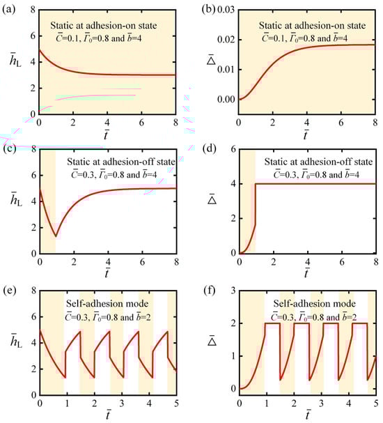 Figure 4 illustrates the dynamic temporal evolution of the light-powered self-adhesion in peeling strip under two distinct motion modes, with specific dimensionless photothermal contraction coefficients , interfacial strength , and distance of the baffle . Characteristic parameters include: , , , and . Yellow shading indicates illumination zones. For certain values of , and , the weight’s submerged length consistently decreases in a smooth, monotonic manner toward stabilization. Meanwhile, the strip’s vertical peeling displacement reaches a stable equilibrium, remaining in a persistent adhesion-on state, this represents the static mode (Figure 4a,b). In contrast, for other values of , and , weight’s submerged length first gradually decreases, then suddenly increases, before slowly rising toward a balanced value. The strip’s vertical peeling displacement initially shows a gradual increase, followed by a sharp jump, and finally stabilizes, indicating that the strip eventually rests in the adhesion-off state. This motion mode also falls under the category of a static mode (Figure 4c,d). For further combinations of , and , weight’s submerged length undergoes phase-locked alternations: a controlled gradual decline → a sharp, abrupt surge → a modulated decline → and a final, sharp drop. The strip’s vertical peeling displacement experiences a pronounced cyclic progression: a subtle, gradual increase → a sudden, accelerated surge → a sustained steady-state → followed by a rapid, sharp decline. These autonomous periodic oscillations represent continuous, reversible transitions between adhesion-on and adhesion-off states under constant steady illumination, defining the self-adhesion mode (Figure 4e,f). It is worth noting that Figure 3 presents the theoretical predictions based on Equations (32) to (44). Certain factors in real-world scenarios, which are not considered in the theoretical model, may have a quantitative, rather than qualitative, impact on the results.