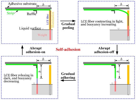 Upon release of the weight, the gravitational force induces the tension of LCE fiber, generating a peeling force on the elastic strip. This peeling force is counteracted by the adhesive force of the substrate, thereby maintaining the strip in an almost fully bonded adhesion-on state. In the initial state, a steady light illuminates a narrow zone near the central plane of the LCE fiber, leaving the rest in darkness, as shown in Figure 2b. Since the LCE fiber in the illuminated zone, contraction along its length occurs. As a result, the weight gradually rises above the liquid surface, leading to a corresponding decrease in buoyancy, thereby increasing the tension of the LCE fiber and the peeling force on the strip. This initiates a gradual separation at the strip-substrate interface, marking the transition toward an adhesion-off state, as shown in Figure 2c. With further contraction of the LCE fiber and an increase in the peeling force on the strip, sudden detachment from the substrate may occur. However, peeling ceases at the baffle position (Figure 2d), marking the adhesion-off state. In this state, the weight submerges deeper, abruptly increasing buoyancy while the LCE fiber moves into the dark zone. Subsequent relaxation of the LCE fiber in darkness further increases submersion depth and buoyancy. This elevated buoyancy reduces both LCE fiber’s tension and peeling force, enabling strip reattachment to the substrate due to adhesion—thus re-establishing the adhesion-on state. Accordingly, the LCE fiber moves back to the illuminated zone. Thus, periodic oscillations of the LCE fiber between illumination zones and darkness drive cyclical transitions of the strip between adhesion-on and adhesion-off states, as shown in Figure 2c,d.