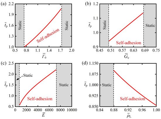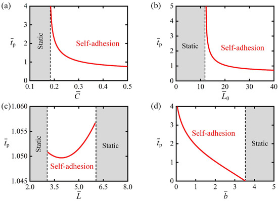 For analytical simplification, the following dimensionless quantities are defined: , , , , , , , , , , , , , , , and . During the self-adhesion, the dimensionless buoyant force in Equation (5) is re-expressed as