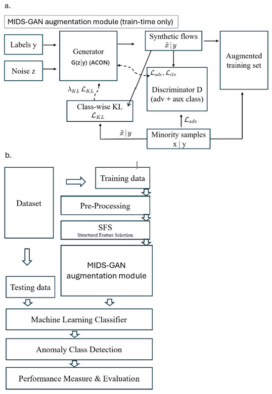 Overview of the proposed MIDS-GAN framework: (a) train-time augmentation module using ACON-activated ACGAN with class-wise KL alignment; and (b) integration into the end-to-end IDS workflow encompassing preprocessing, structured feature selection, and classifier evaluation.