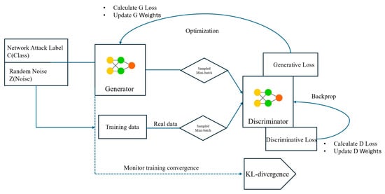 Algorithm 1 outlines the adversarial training process of the proposed MIDS-GAN, which integrates conditional generation [25], auxiliary classification [26], and the adaptive ACON activation [8]. The process begins with the initialization of generator and discriminator parameters. For each epoch, real samples from the dataset and synthetic samples generated by are alternately used to update the discriminator , following the mini–max adversarial framework of Goodfellow et al. [15]. The generator is subsequently updated to minimize the adversarial loss while maintaining class-label consistency, consistent with the ACGAN principle [26]. The ACON activation [8] dynamically adapts neuron responses to stabilize gradient flow. Training iterations continue until the class-conditional KL divergence between real and synthetic data distributions converges, ensuring that the generated data are statistically aligned with the minority-class manifold.