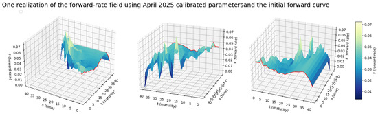 Figure 1 displays one realization of the Kennedy forward rate field on the time–maturity triangle , conditional on the observed initial forward curve for April 2025. The red line highlights the initial forward curve, . The simulation uses the April 2025 parameters obtained from the caplet calibration and the market initial curve as input (see in Section 9). All three panels show the same surface from different viewing angles so that the behaviours along both the calendar–time axis s (discounting time) and the maturity axis t are visible.