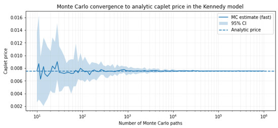 This asymptotic behavior is relevant from both a theoretical and a practical standpoint. The fact that the implied variance decays as for short maturities ensures that the Kennedy model remains well-behaved in the limit of small accrual periods, avoiding volatility spikes that may arise in other forward rate models. From a calibration perspective, this result implies that short-maturity caplets contribute only minimally to the total calibration error, which can improve numerical stability and reduce overfitting.