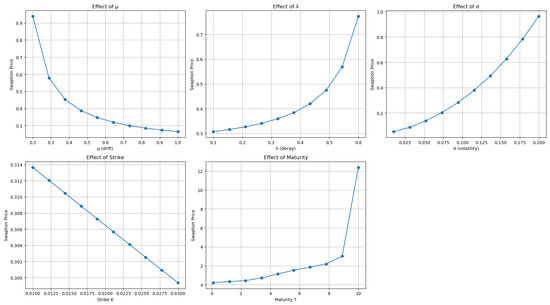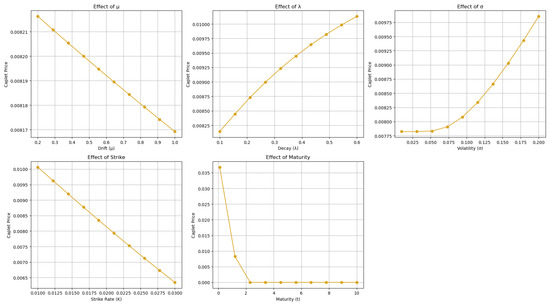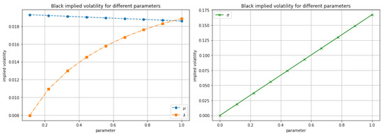 Figure 5 illustrates the sensitivity of the Black implied volatility, obtained from the Kennedy model, with respect to the parameters , , and . We observe that the implied volatility increases as the parameter increases. In contrast, with respect to , the implied volatility increases monotonically, while it decreases mildly as increases. This confirms the intuitive role of as a volatility scaling parameter, while and govern the decay effects in a structurally similar way. Moreover, the sensitivity plots suggest an approximately linear dependence on the parameters within the observed range for and .
