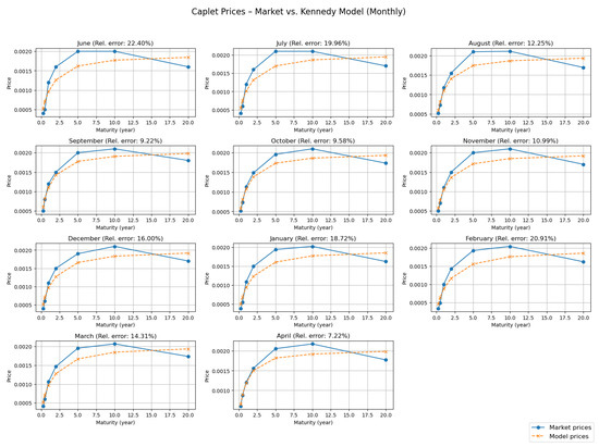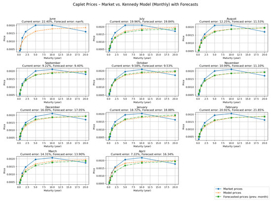 In addition to the calibration quality within each month, we also investigated the predictive performance of the model by evaluating how well parameters estimated in month t forecast caplet prices in month . For each month after the initial one, we computed caplet prices using the forward curve of the current month and the Kennedy parameters calibrated in the previous month. This allowed us to assess the stability and forecasting power of the Kennedy model across time.