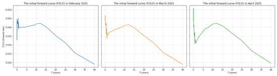 where denotes the zero-coupon bond price at time zero, maturing at time t, defined in Equation (6). The resulting forward curve serves as a deterministic input to the pricing model.