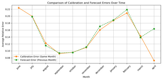 Comparison of monthly average relative errors: in-sample calibration (orange) vs. one-step-ahead forecast (green).