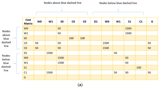 In order to maintain the triangle inequality among travel costs and travel times over arcs, we utilized the Floyd–Warshall algorithm [39]. Triangle inequalities in arc costs and travel times are crucial for VRPs because they enable the CG method to reach elementary paths with respect to customer nodes at optimal columns/routes. This meant an optimal path was not allowed to include customer nodes more than once as it should in real-life cases. We subsequently modified the arc costs calculated by the Floyd–Warshall algorithm to account for extra costs associated with washing processes or loaded condition of vehicles as well as additional profits from satisfying non-contracted customer nodes. Each trailer type was designed to handle a minimum of 50% of the product types according to the trailer–product matrix, which mimicked real-world situations. In addition, trailers were specifically designed to accommodate various types of products, ensuring that each product category could be carried by at least one type of trailer. The washing matrix was artificially created to closely resemble actual operational practices.