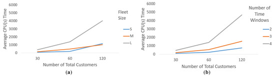 Considering that our problem involves complex structures in high dimensions and each input can have multiple values, one can analyze the computational time in a multi-dimensional context. Figure 11 allows for the exploration of the two-dimensional view regarding computational time across instances, each of which is consistently tagged as the number of customer points (a familiar concept in the VRP literature). An additional one is chosen from the inputs mentioned in Table 7. It is known in the VRP literature that an escalation in customer nodes can substantially exacerbate the computational time. Additionally, as depicted in Figure 11, additional dimensions can add extra difficulties. Our goal was to investigate how CPU time is affected when additional complexities are introduced into our FTL structure. For instance, instances with a high number of time windows and customer points lead to a larger exponential increase in CPU time compared to those with a huge number of washing centers and customer nodes. Figure 11b shows that, as the number of time windows and customers grows, the computation time increases significantly compared to Figure 11a,c–f. This trend is clear, as the gap between the lines in Figure 11b widens with larger customer sizes. On the other hand, Figure 11d shows that growth in the number of departure points brings about the smallest shift among others, while the customer number rises because of the fact that the gap between lines is not significantly widening compared to others. Furthermore, in relation to Figure 11e,f, CPUs exhibit greater sensitivity in Figure 11f because of an increased gap between the lines in Figure 11f. This circumstance suggests that, as the number of customers increases, CPU time shows a more pronounced response to the increasing number of trailer types compared to the increasing number of product types. With regard to Figure 11a, at first glance, one may consider that a change in fleet size does not have a visible effect on CPU time when fleet sizes are medium or small. However, it is clear that large fleet sizes significantly increase CPU time when the number of customers surges compared to other fleet sizes.