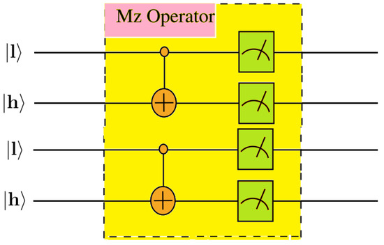 The operator is used in the proposed algorithm to solve the assumed problem statement. This operator receives two decoupled versions of the qubit . The normalized state of each version is There are also two extra qubits, with each of them called , and they are initialized in the state . Then, the circuit applies two CNOT gates between each pair of the control qubit and the target qubit , as shown in Figure 1, leaving each pair of these two qubits in the normalized state explained by Equation (1).