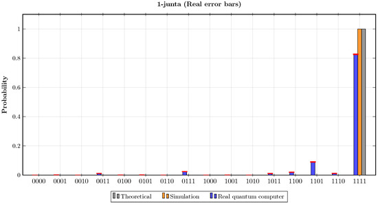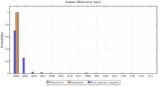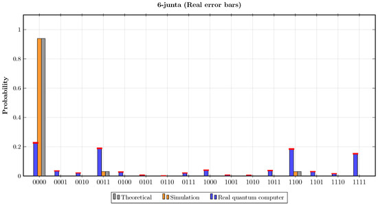 In the sixth experiment, the oracle encoded the Boolean function . The results of this experiment are presented in Figure 8. It can be observed that the probabilities , and in the theoretical calculations and in the simulation results were approximately , , and . Consequently, both theoretically and according to the simulation result, when estimating k for this oracle using Step 7 of the proposed algorithm, and . In contrast, when the quantum circuit of the proposed algorithm was implemented on the real quantum computer for the first oracle, the probabilities of the basis state were , , and . Hence, according to Step 7 in the proposed algorithm, the number of junta variables, which was estimated when implementing the algorithm on the real quantum computer, was . The statistical fidelities of this experiment were and .