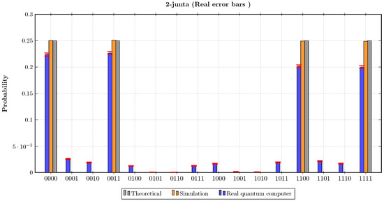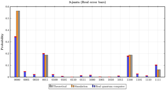 In the fourth experiment, the oracle encoded the Boolean function . The results of this experiment are presented in Figure 6. It can be observed that the probabilities , and in the theoretical calculations and in the simulation results were approximately , , , and . Consequently, both theoretically and according to the simulation result, when estimating k for this oracle using Step 7 of the proposed algorithm, . In contrast, when the quantum circuit of the proposed algorithm was implemented on the real quantum computer for the first oracle, the probabilities of the basis states were , and . Consequently, according to Step 7 in the proposed algorithm, the number of junta variables, which was estimated when implementing the algorithm on the real quantum computer, was . The statistical fidelities of this experiment were and .