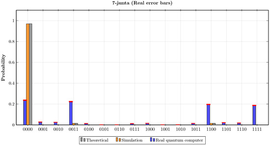 In the seventh experiment, the oracle encoded the Boolean function . The results of this experiment are presented in Figure 9. It can be observed that the probabilities of , and in the theoretical calculations and in the simulation results were approximately , and . Consequently, both theoretically and according to the simulation result, when estimating k for this oracle using Step 7 of the proposed algorithm, and . In contrast, when the quantum circuit of the proposed algorithm was implemented on the real quantum computer for the first oracle, the probabilities of the basis state were , and . According to Step 7 in the proposed algorithm, the number of junta variables, which was estimated when implementing the algorithm on the real quantum computer, was . The statistical fidelities of this experiment were and .
