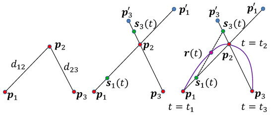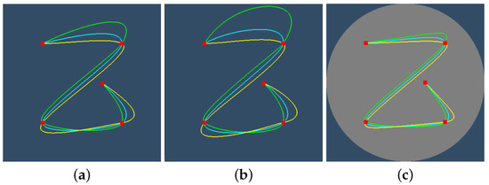 z coordinate of the SQUAD solution is fixed to zero. To make the different solutions similar, we set the bias and tension parameters to one and assigned the natural numbers to the knot values since unlike our solution, de Casteljau’s method and the SQUAD both assume uniform parametrization. To find a spline point for a given parameter value, our method requires 1.1 μs computation time on a Intel i7 2.6GHz processor (Intel Corporation, Santa Clara, CA, USA), SQUAD 0.6 μs, and de Casteljau’s method 1.8 μs. This corresponds to the fact that our method needs seven geodesic interpolations per segment, SQUAD uses three, and de Casteljau’s approach
